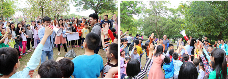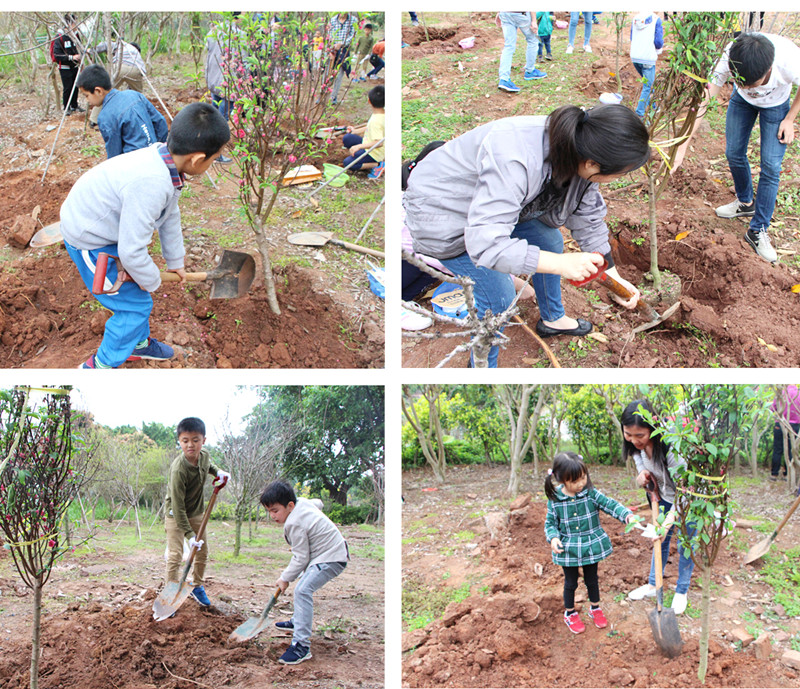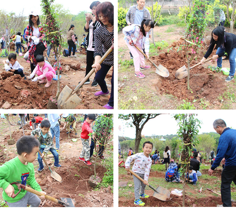 在植树过程中,家长和孩子们团结协作、干劲十足