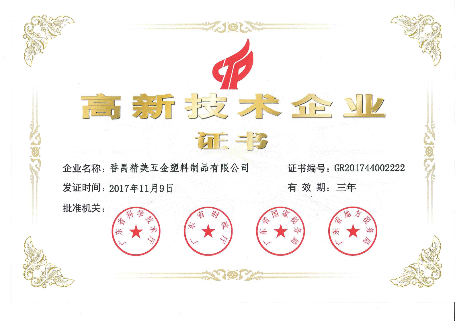 日前,JMA旗下的番禺精美五金塑料制品有限公司及番禺镀化研机械制造有限公司,同时获得了由广东省科学技术厅、广东省财政厅、广东省国家税务厅、广东省地方税务厅联合颁发的“高新技术企业”证书。