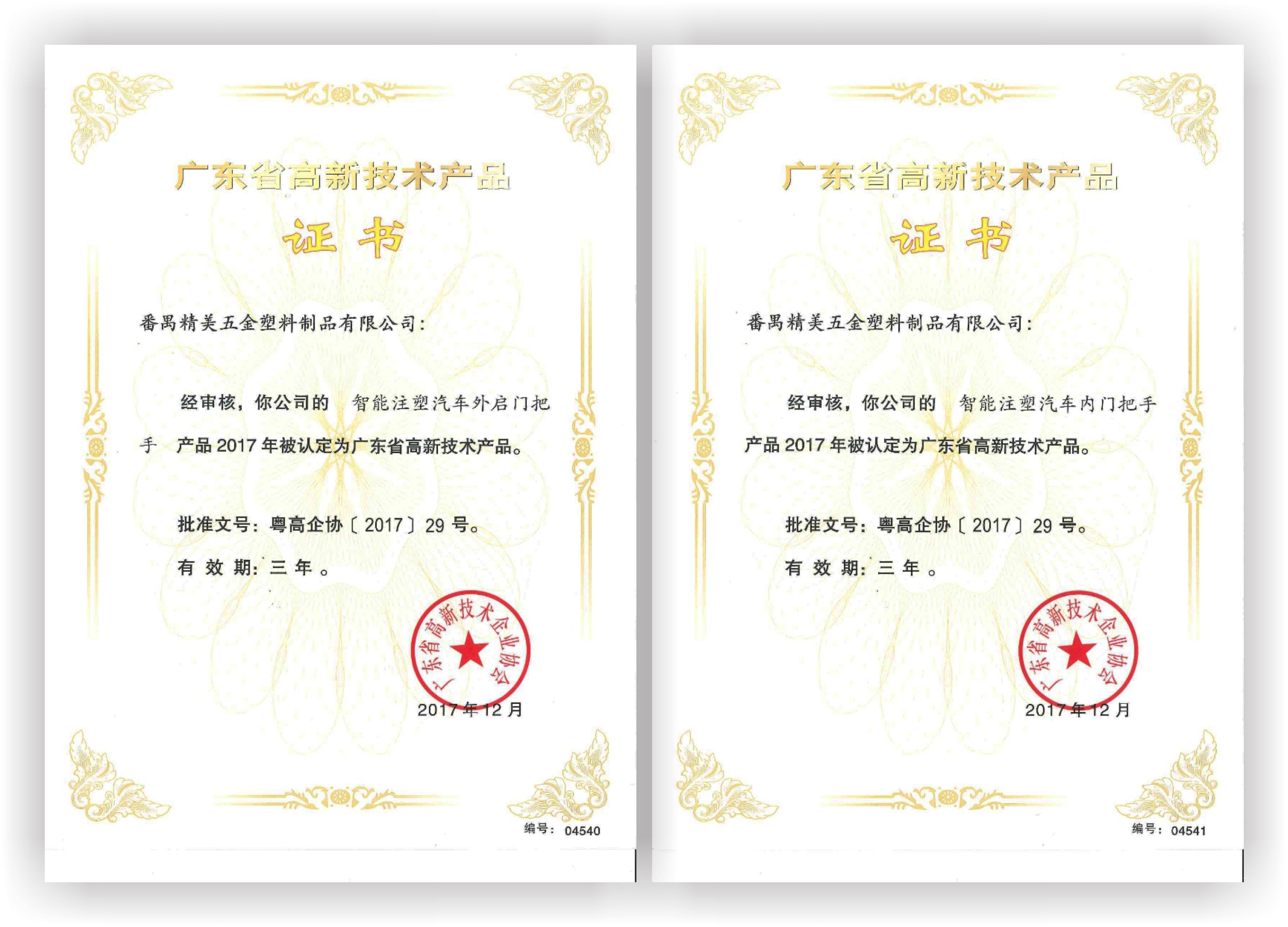 此外,番禺精美五金塑料制品有限公司的智能注塑汽车内门把手、智能注塑汽车外启门把手荣获广东省高新技术产品,番禺镀化研机械制造有限公司的电镀精磨汽车内门把手、电镀精磨汽车外启门把手荣获广东省高新技术产品。